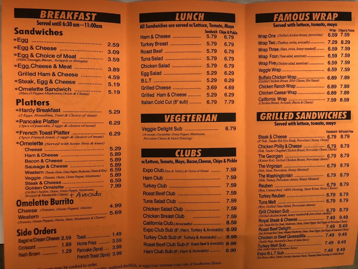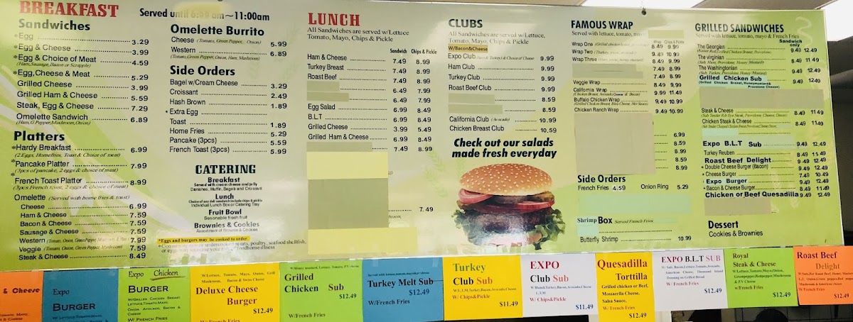 For sandwich lovers, the Clubs section presents hearty options such as the signature Expo Club and the classic Ham Club, each offering a delightful combination of fresh ingredients and savory fillings. If you prefer grilled sandwiches, you can indulge in the Steak And Cheese or the equally flavorful Chicken Steak And Cheese, both grilled to perfection and served hot.